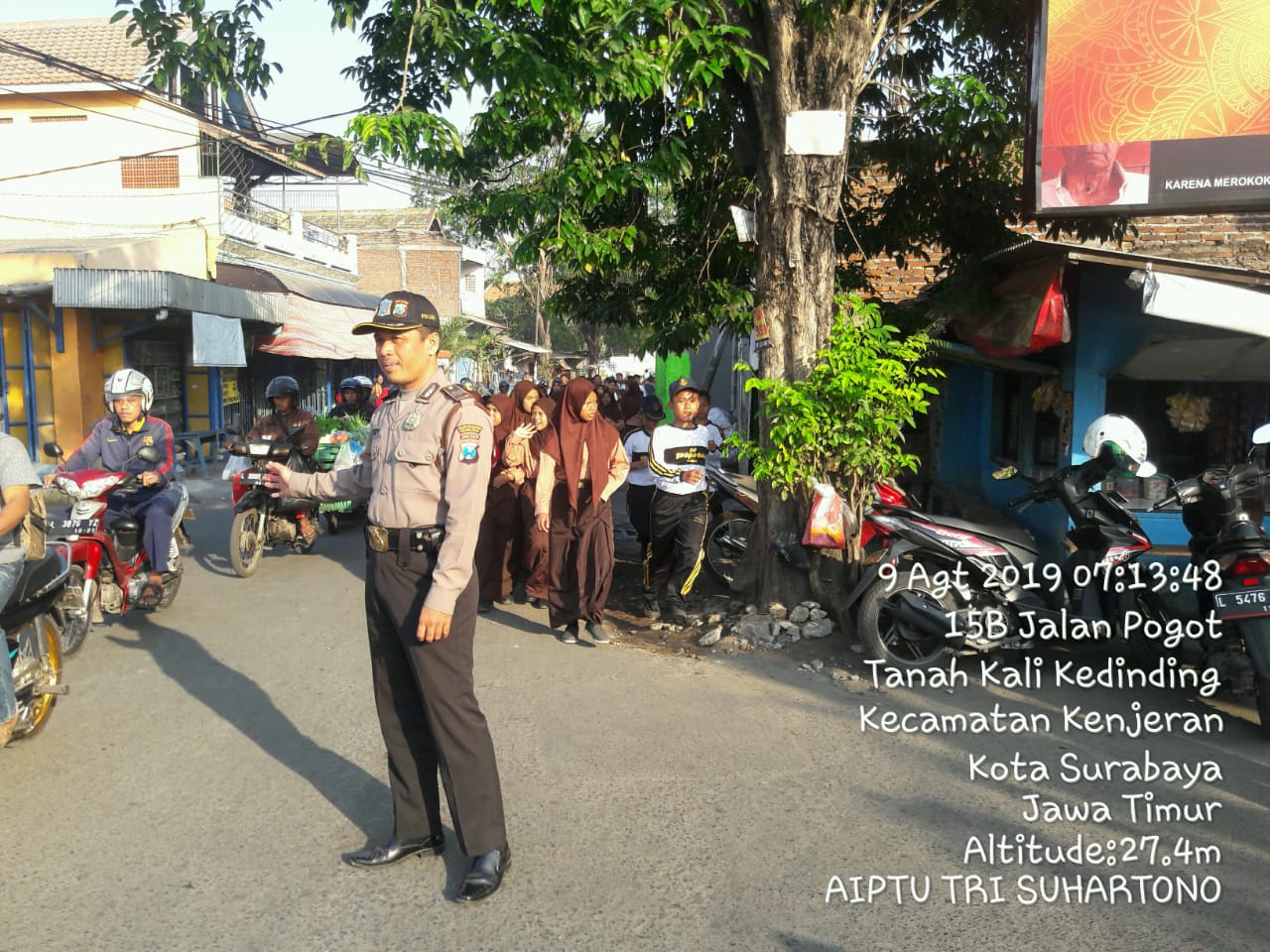 Seputarperak.com- Pengawalan dilakukan Polsek Kenjeran untuk mengamankan kegiatan jalan sehat yang dilaksanakan murid-murid SMP YP 17 Jalan Randu, Jumat pagi, 9 Agustus 2019.
