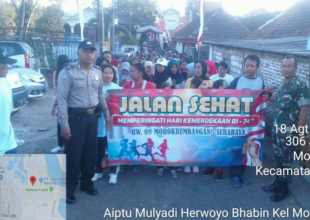 Seputarperak.com- Acara jalan sehat dilaksanakan warga RW 08 Kelurahan Morokrembangan, Minggu pagi, 18 Agustus 2019 dalam rangka memperingati HUT ke-74 Republik Indonesia.