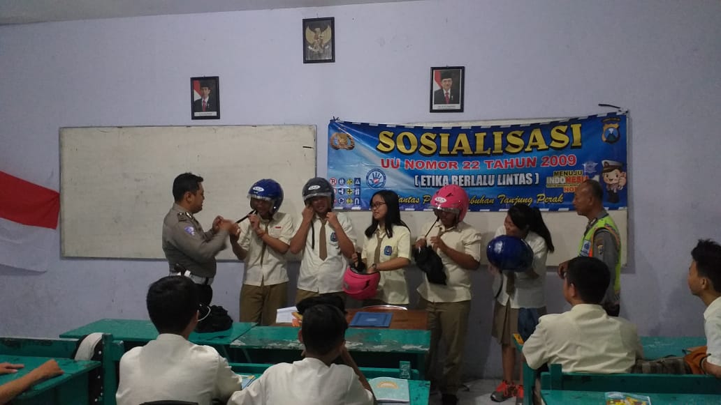 Seputarperak.com- Sosialisasi undang-undang nomor 22 tahun 2009 tentang lalu lintas dan angkutan jalan disampaikan anggota Dikyasa Satlantas Polres Pelabuhan Tanjung Perak di SMA Sasana Bhakti, Jalan Jagalan, Rabu pagi, 21 Agustus 2019.