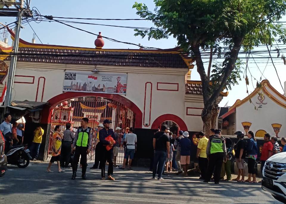 Seputarperak.com- Pengamanan pembagian sembako di Klenteng Pak Kik Bio di Jalan Jagalan, Minggu pagi, 25 Agustus 2019 dilakukan Polsek Pabean Cantikan, Polres Pelabuhan Tanjung Perak.