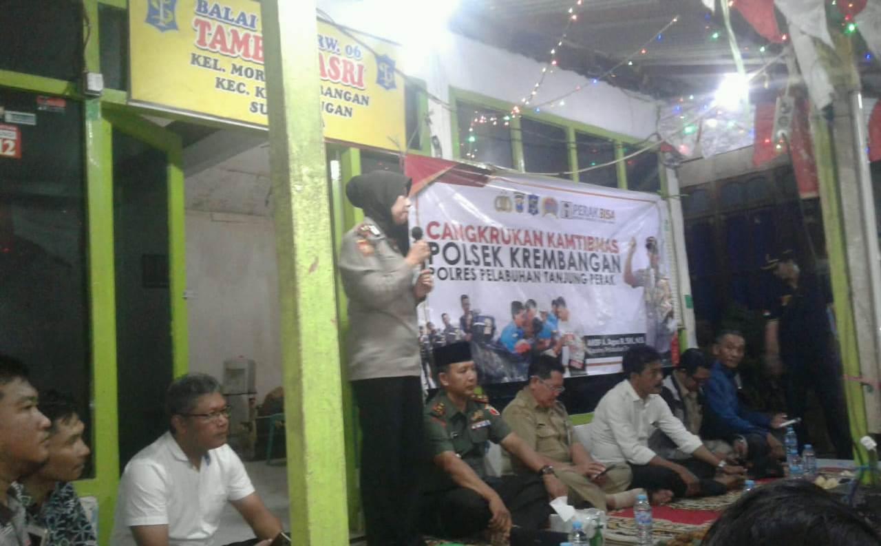 Dihadapan warga, Kapolsek Krembangan yang memimpin acara cangkrukan ini menyampaikan pesan-pesan kamtibmas. Termasuk diantaranya himbauan agar warga aktif melaksanakan kegiatan siskamling yang dinilai efektif mencegah aksi 3C (Curat, Curas dan Curanmor) di malam hari.