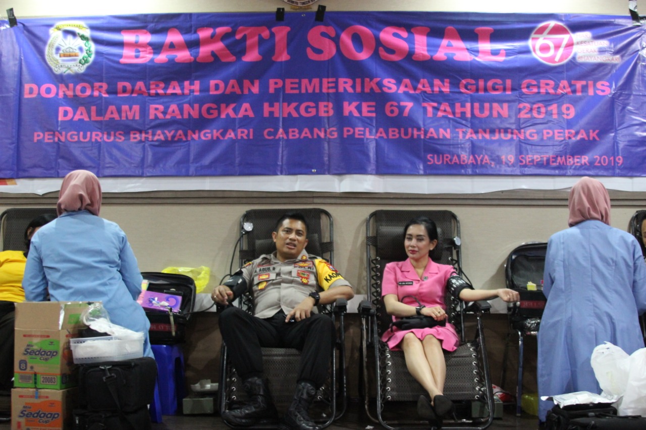 Seputarperak.com- Pemeriksaan gigi gratis dan donor darah digelar di Mapolres Pelabuhan Tanjung Perak dalam rangka memperingati Hari Kesatuan Gerak Bhayangkari (HKGB) Ke 67, Kamis pagi, 19 September 2019.