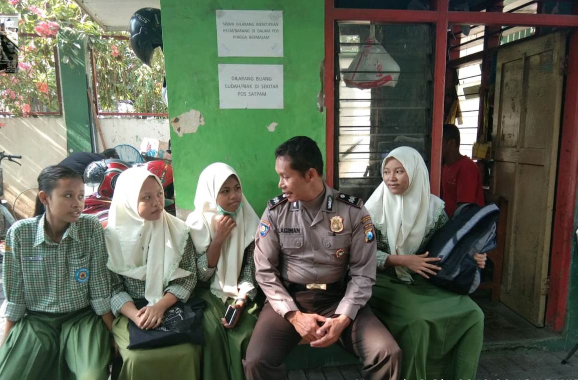 Seputarperak.com- Pesan positif disampaikan Aiptu Lagiman, Babinkamtibmas Tanah Kali (Takal) Kedinding, Polsek Kenjeran, Polres Pelabuhan Tanjung Perak kepada sejumlah siswi SMAN 19, Jalan H.M Noer, Rabu pagi, 2 Oktober 2019.
