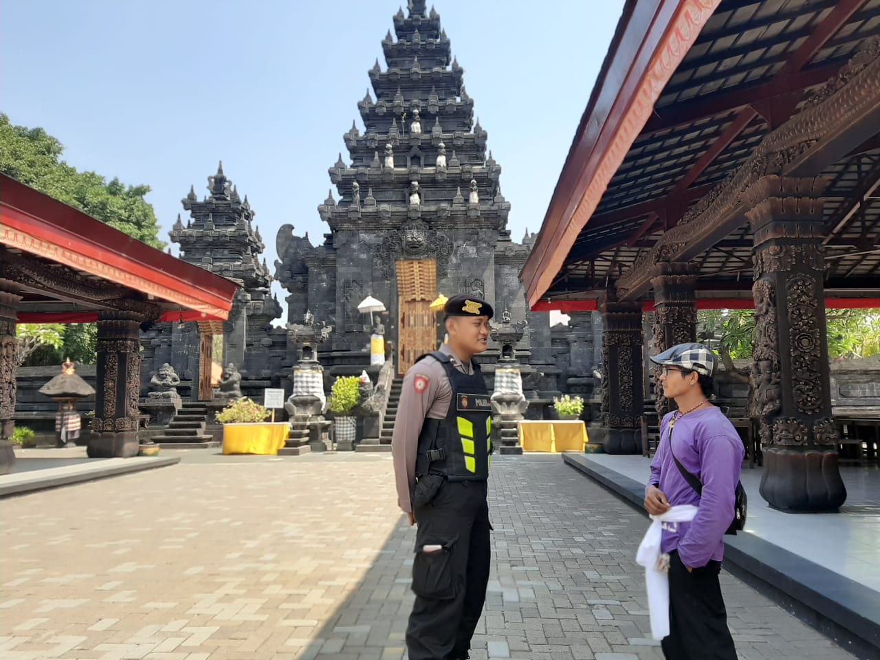 Saat itu selain melakukan pemantauan di sekeliling pura untuk mengantisipasi tindak kriminalitas 3C (Curat, Curas dan Curanmor) serta kerawanan lainnya, personil Satsabhara juga menyampaikan pesan kamtibmas kepada petugas keamanan setempat.