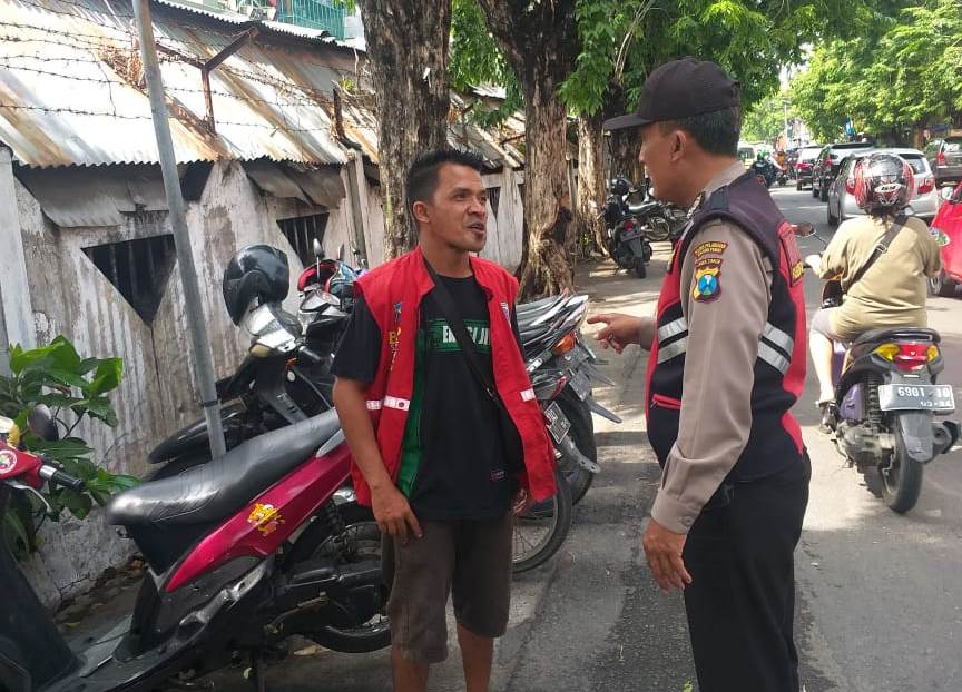 Seputarperak.com- Himbauan ketertiban disampaikan Aiptu Made Suarthana, Babinkamtibmas Bongkaran, Polsek Pabean Cantikan, Polres Pelabuhan Tanjung Perak kepada petugas parkir di Jalan Waspada, Selasa pagi, 7 Januari 2020.