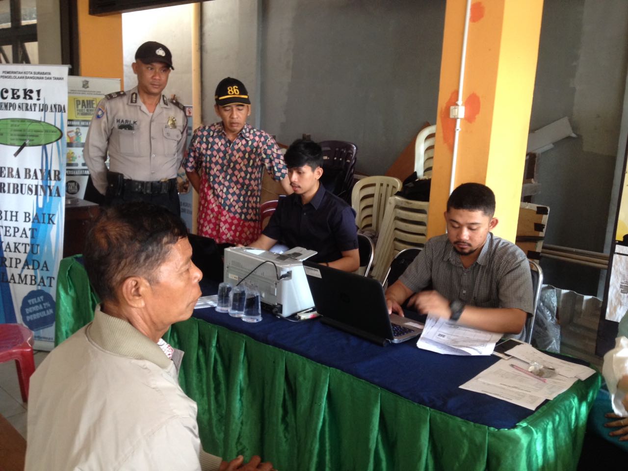 Seputarperak.com- Dalam rangka penerimaan uang sewa tanah surat hijau, beberapa petugas dari Dinas Pengelolaan Bangunan dan Tanah Pemkot Surabaya, mendatangi Aula Kelurahan Wonokusumo, Kecamatan Semampir, Rabu, 25 Juli 2018.