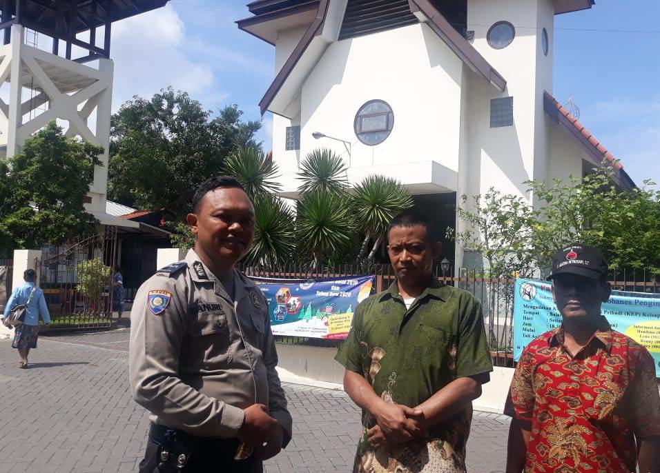 Seputarperak.com- Pengamanan kebaktian dilakukan Aipda Yanuri, Babinkamtibmas Perak Barat, Polsek Krembangan, Polres Pelabuhan Tanjung Perak di Gereja Santo Mikael, Jalan Tanjung Sadari, Minggu pagi, 2 Pebruari 2020.