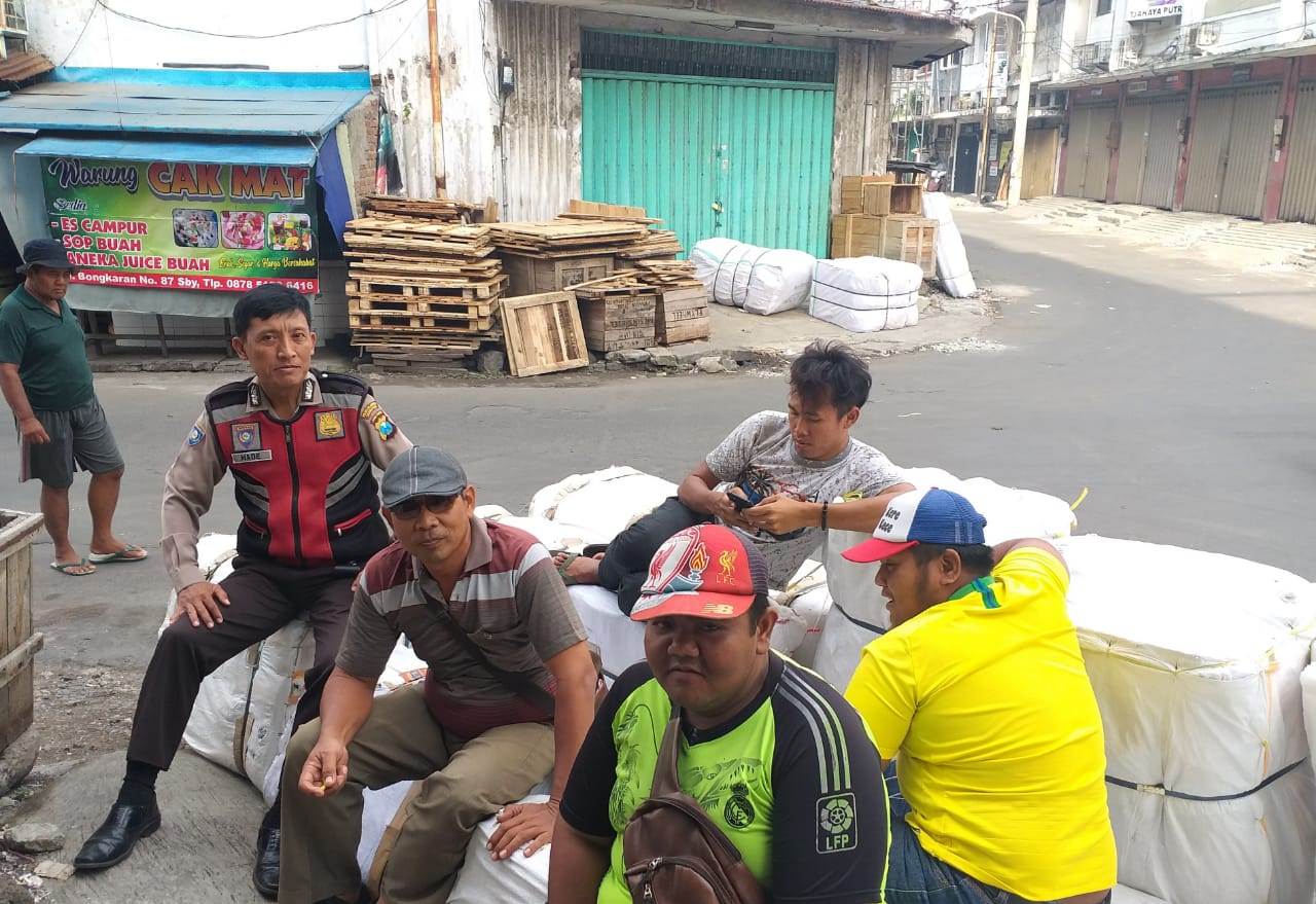 Seputarperak.com- Himbauan jaga ketertiban disampaikan Aiptu Made Suarthana, Babinkamtibmas Bongkaran, Polsek Pabean Cantikan, Polres Pelabuhan Tanjung Perak kepada sejumlah karyawan ekspedisi di Jalan Bongkaran, Senin pagi, 10 Pebruari 2020.