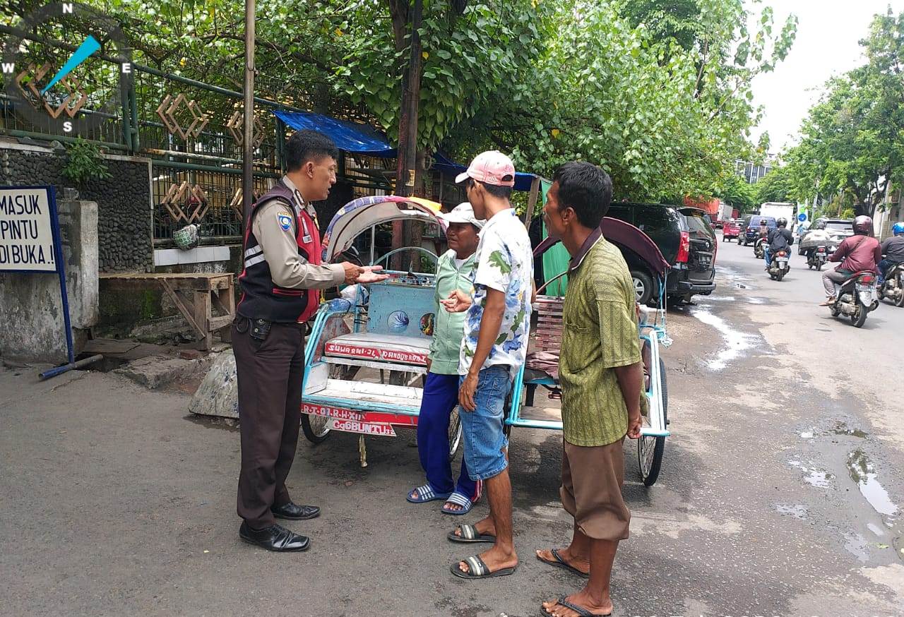 Seputarperak.com- Himbauan jaga ketertiban disampaikan Aiptu Made Suarthana, Babinkamtibmas Bongkaran, Polsek Pabean Cantikan, Polres Pelabuhan Tanjung Perak kepada beberapa penarik becak di Jalan Waspada.
