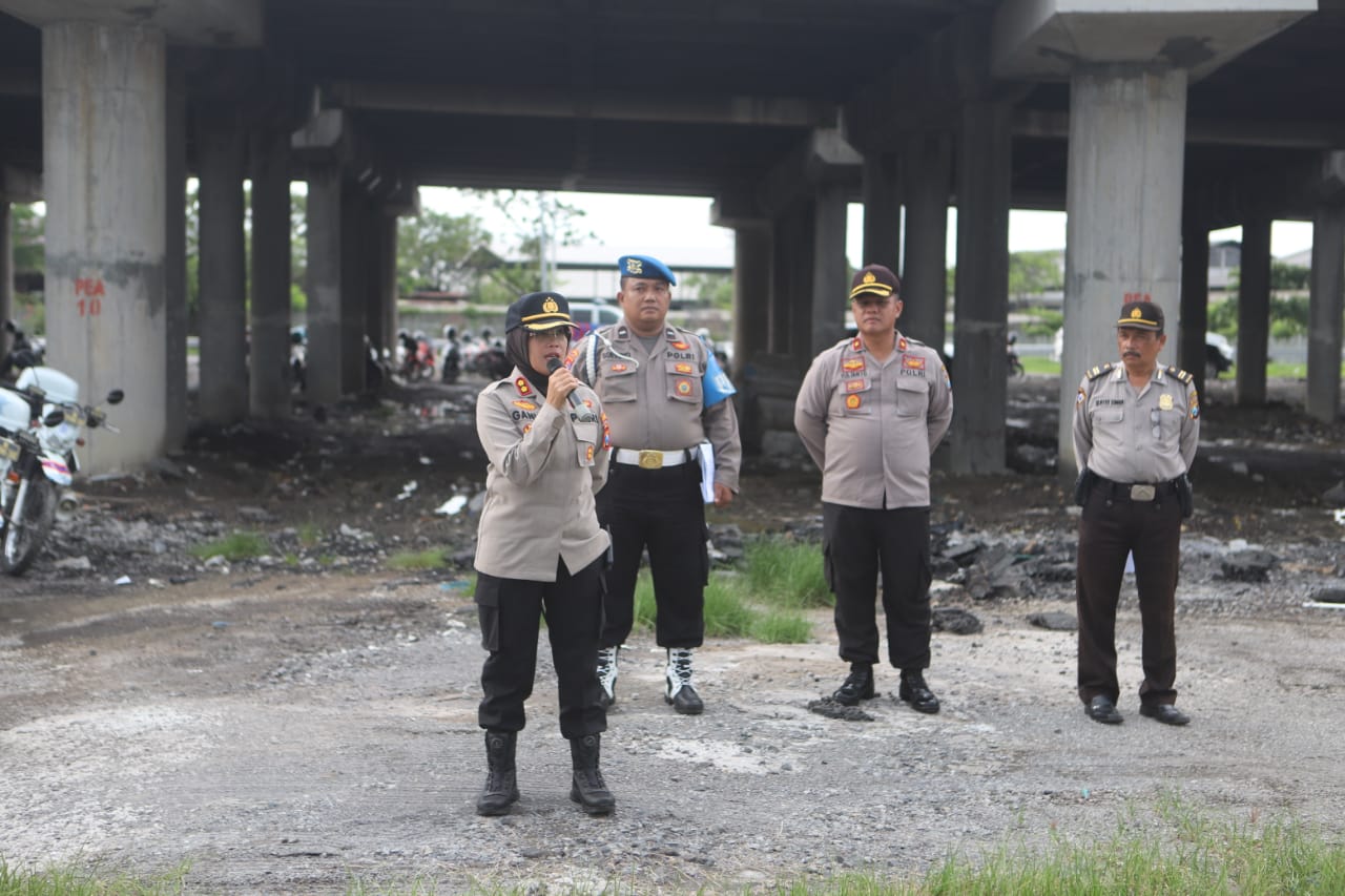 Seputarperak.com- Kapolres Pelabuhan Tanjung Perak, AKBP Ganis Setyaningrum, S.Si, MH memimpin apel pengamanan jalur lintasan Bonek di bawah tol Tandes Timur, Sabtu sore, 29 Pebruari 2020.