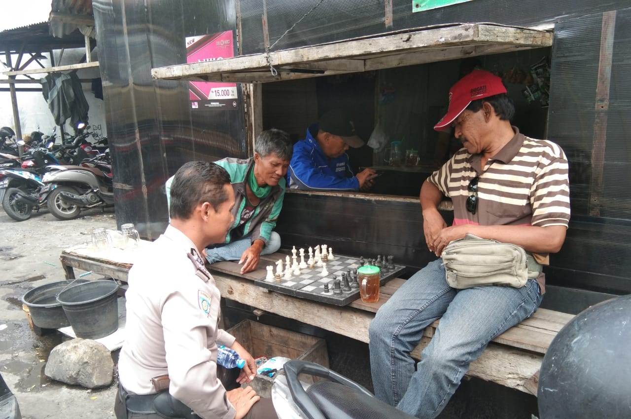 Seperti yang dilakukan Aiptu Lagiman, Babinkamtibmas Tanah Kali (Takal) Kedinding, Polsek Kenjeran, Polres Pelabuhan Tanjung Perak saat menemui warga yang sedang bertanding catur di warung kopi (Warko) Giras Jalan HM Noer, Kamis siang, 5 Maret 2020.