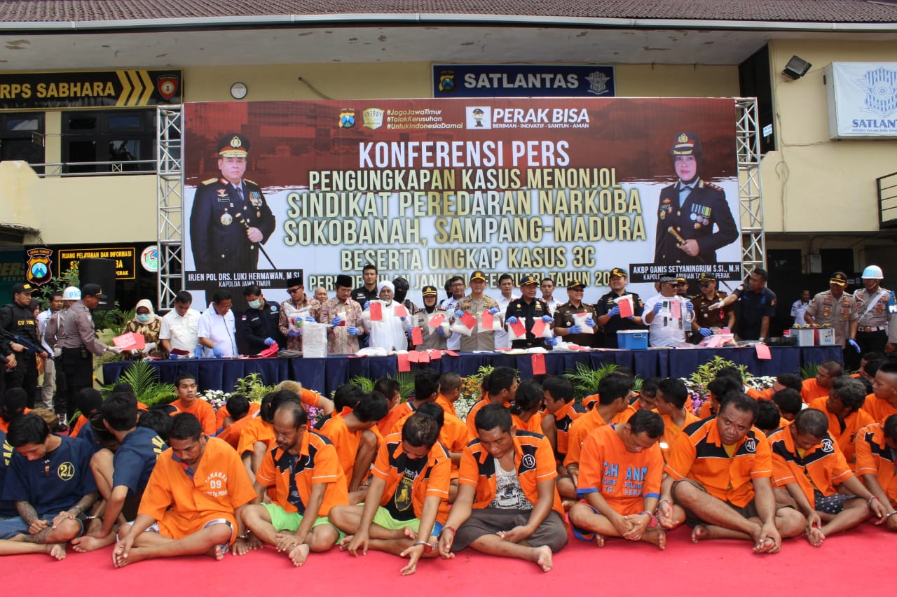 Kegiatan yang dipimpin Irwasda Polda Jatim Kombes Pol Awi Setiyono mewakili Kapolda Irjen Luki Hermawan ini ada penangkapan pelaku jaringan narkoba Sokobanah, Sampang Madura dari 72 pelaku yang dihadirkan dihadapan wartawan.