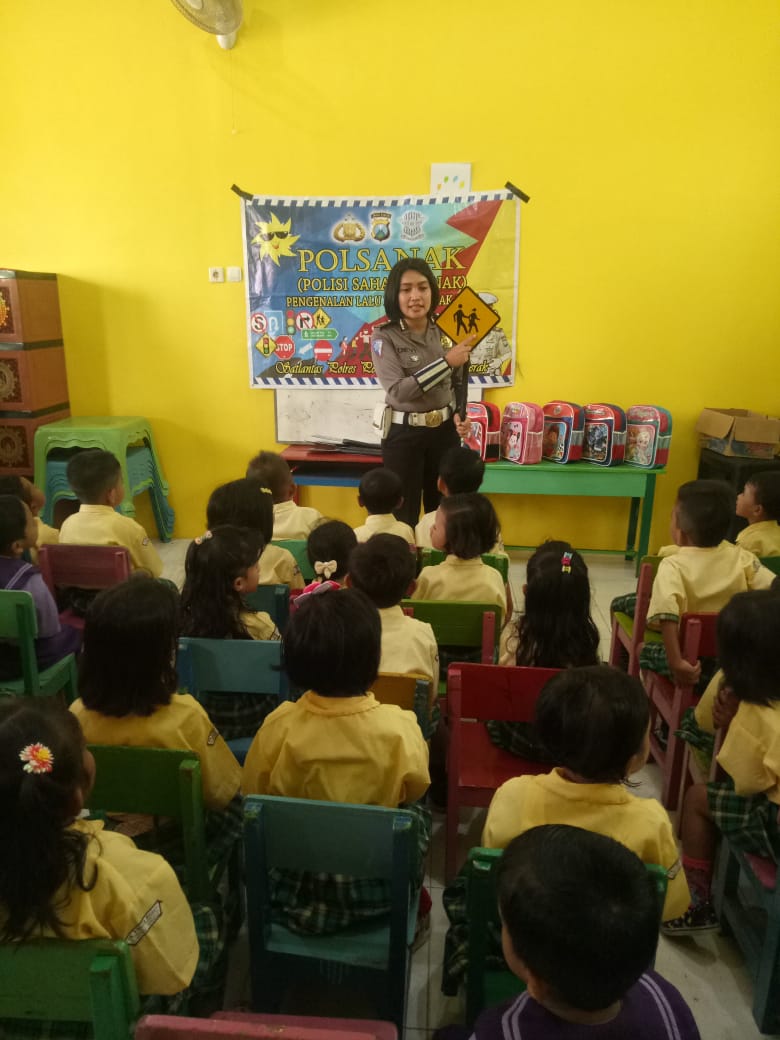 Personil Polwan Unit Dikyasa Satlantas Polres Pelabuhan Tanjung Perak, nampak antusias memberikan pemahaman mengenai rambu-rambu lalu lintas kepada sekitar 50 orang murid TK Panca Bhakti.