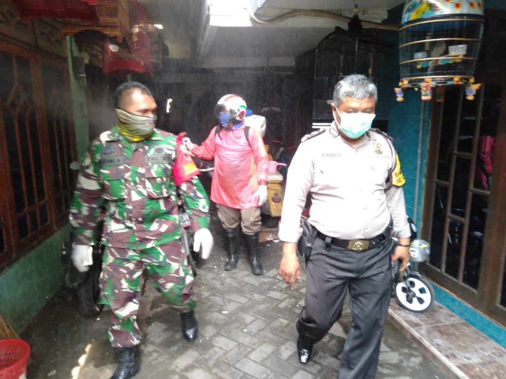 Seputarperak.com- Penyemprotan disinfektan dilakukan Aiptu Heru Winarto, Babinkamtibmas Perak Utara, Polsek Pabean Cantikan, Polres Pelabuhan Tanjung Perak bersama Babinsa Koramil Pabean Cantikan di RT 01 RW 09, Sabtu siang, 28 Maret 2020.
