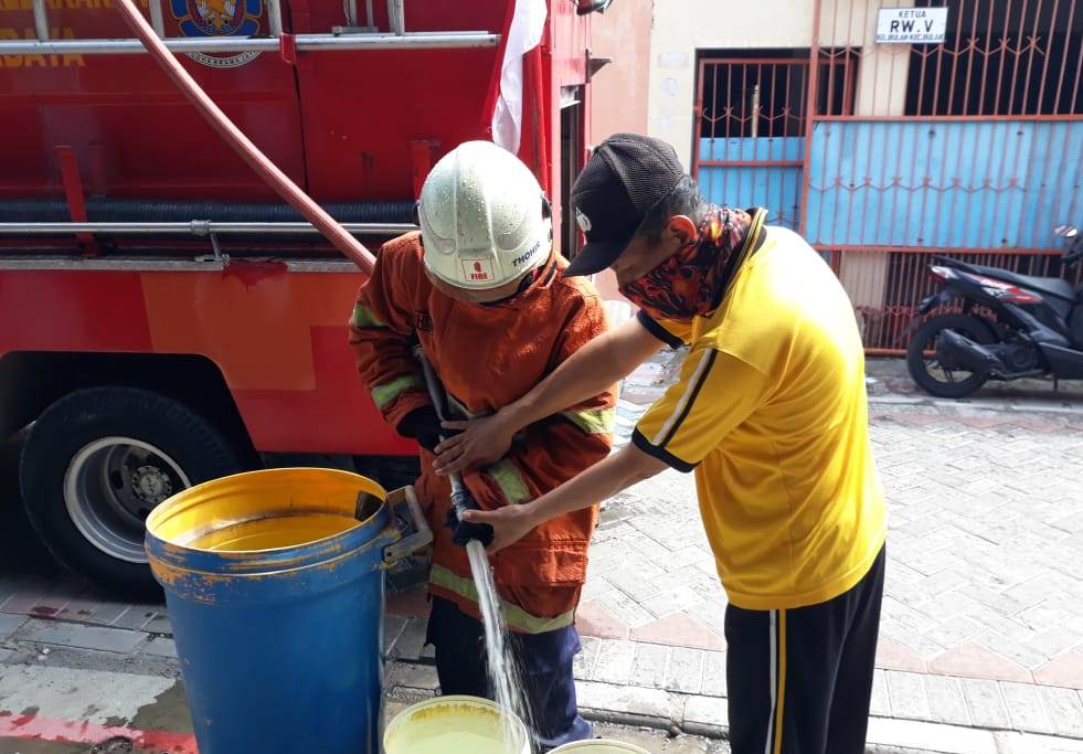 Seputarperak.com- Penyemprotan disinfektan untuk mencegah penyebaran virus corona dilakukan Aiptu Supriadi, Babinkamtibmas Bulak, Polsek Kenjeran, Polres Pelabuhan Tanjung Perak bersama petugas pemadam kebakaran (Damkar) di pemukiman Jalan Bulak Setro, Jumat siang, 3 April 2020.