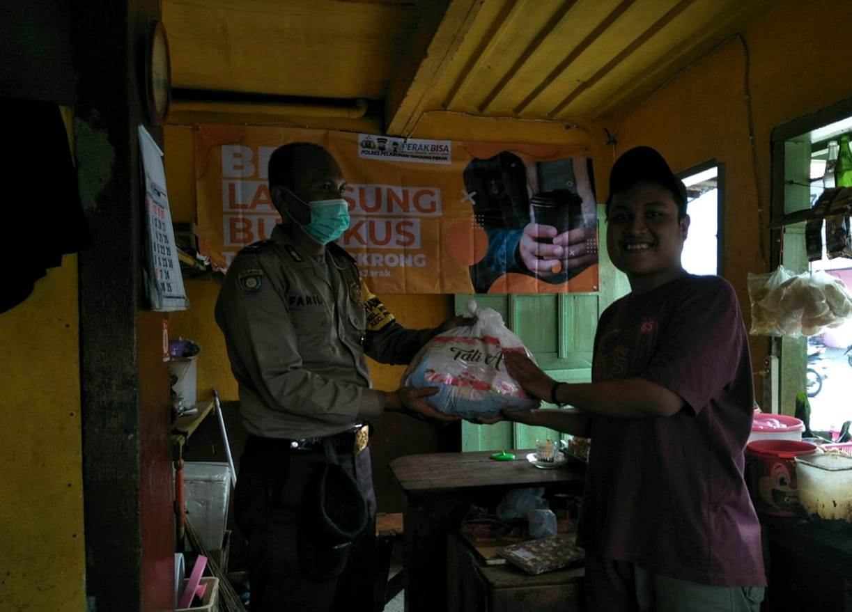 Selain melakukan pemasangan spanduk, Aipda Farid juga memberikan bantuan paket sembako dari Kapolres Pelabuhan Tanjung Perak, AKBP Ganis Setyaningrum, S.Si, MH sebagai bentuk kepedulian terhadap pedagang yang mengalami penurunan penghasilan akibat virus corona.