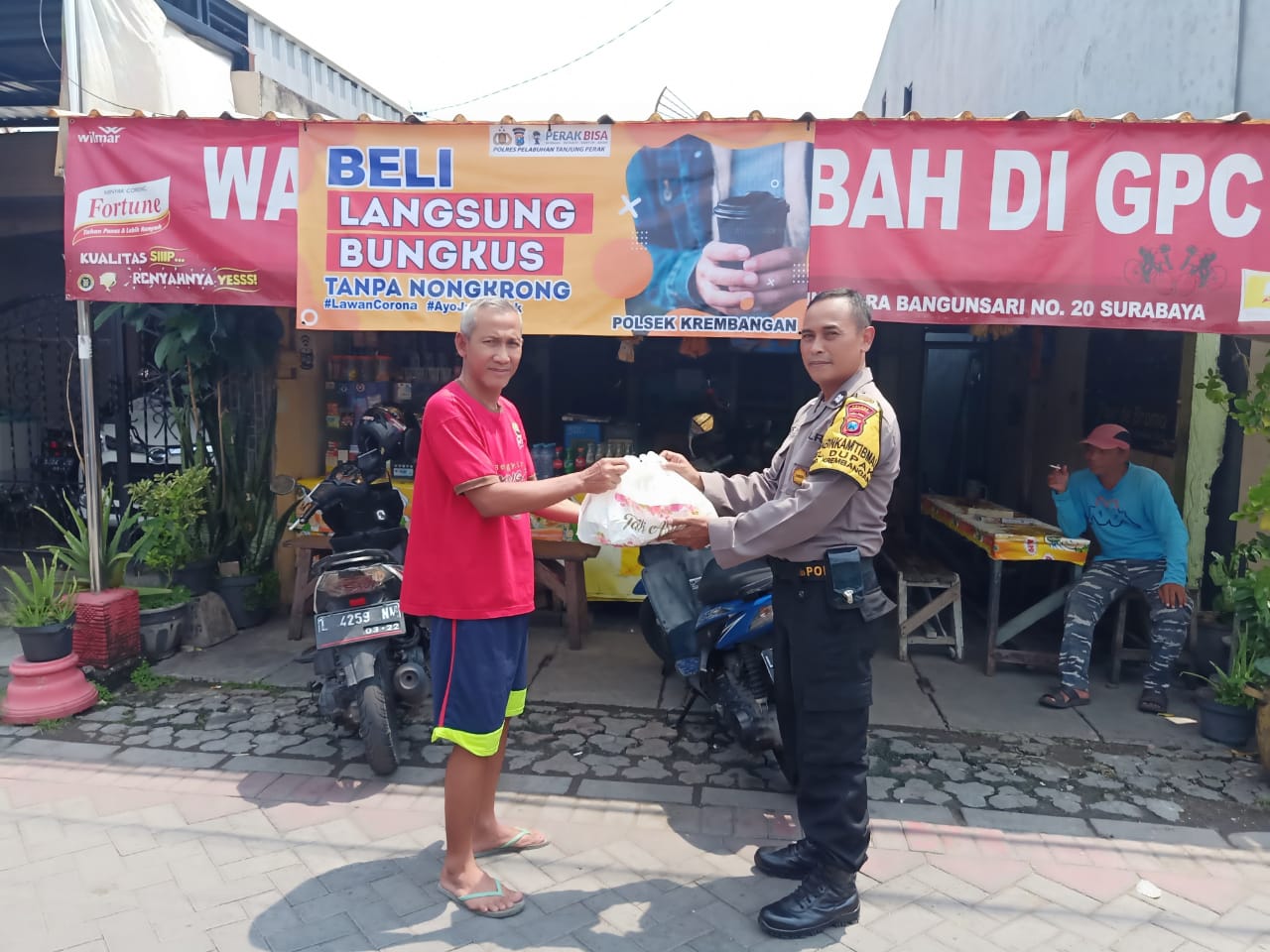 Seputarperak.com- Pemasangan spanduk berisi himbauan ‘Beli Langsung Bungkus, Tanpa Nongkrong’ dilakukan Aiptu Arief, Babinkamtibmas Dupak, Polsek Krembangan, Polres Pelabuhan Tanjung Perak di warung kopi (Warkop) Mbah Di, Jalan Alun Alun Utara.