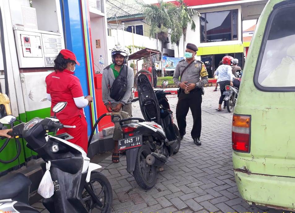 Seperti halnya yang dilakukan Aipda Yanuri, Babinkamtibmas Perak Barat, Polsek Krembangan saat mendatangi SPBU depan Hotel Antariksa, Jalan Gresik-Gadukan, Minggu malam, 5 April 2020.