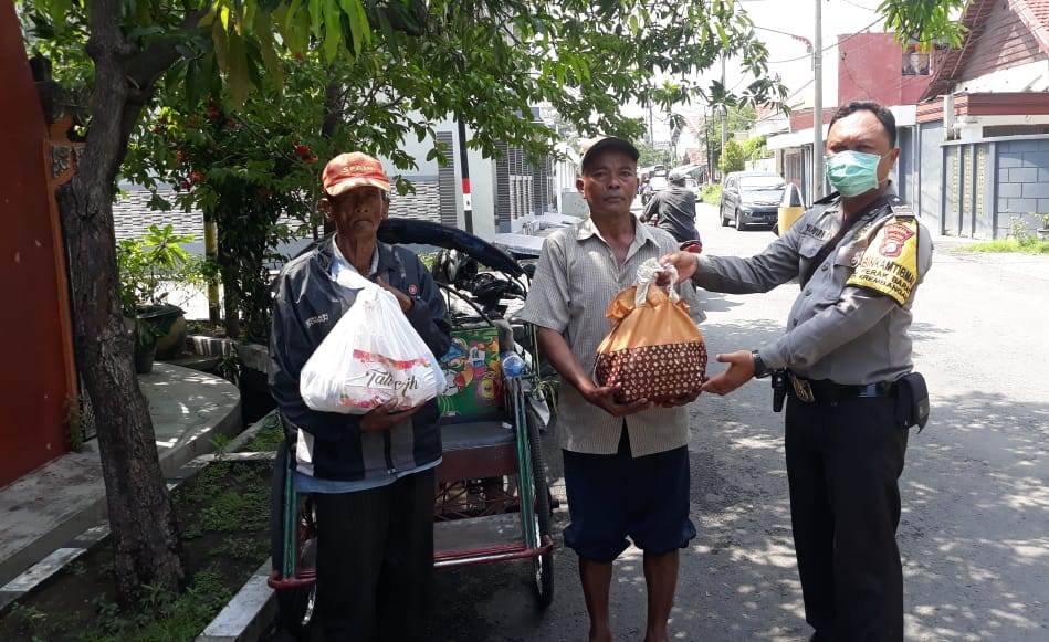 Seputarperak.com- Sumbangan paket sembako diberikan Aipda Yanuri, Babinkamtibmas Perak Barat, Polsek Krembangan, Polres Pelabuhan Tanjung Perak kepada penarik becak dan PKL di sejumlah kawasan di wilayahnya, Rabu siang, 8 April 2020.