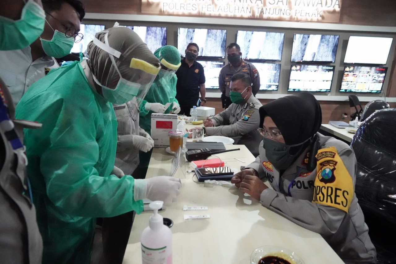 Selain Kapolres, kegiatan pemeriksaan Rapid tes yang dilaksanakan oleh Bid Dokkes Polda Jatim ini juga dilakuakn terhadap para pejabat utama (PJU) Polres Pelabuhan Tanjung Perak.