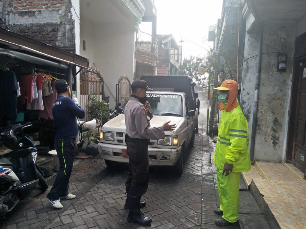 Diterangkan Kapolsek Asemrowo, AKP Hari Kurniawan, kegiatan penyemprotan disinfektan sekaligus himbauan cegah penularan virus corona rajin disampaikan kepada masyarakat.