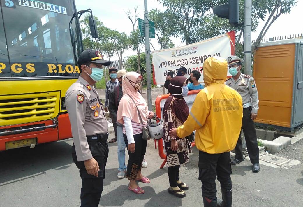 Seputarperak.com- Kapolsek Asemrowo, Polres Pelabuhan Tanjung Perak, AKP Hari Kurniawan melakukan pemeriksaan suhu badan dan sterilisasi penumpang angkutan umum di Pos Lantas Dupak Rukun, Rabu pagi, 15 April 2020.
