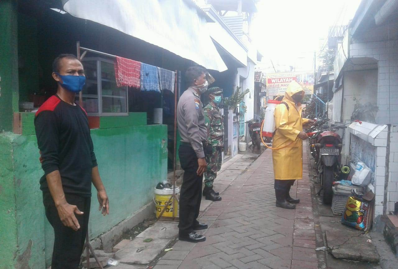 Penyemprotan disinfektan ini dilaksanakan oleh pegawai kelurahan di bawah pengawalan Aiptu Mulyadi Herwoyo, Babinkamtibmas Morokrembangan, Polsek Krembangan, Polres Pelabuhan Tanjung Perak bersama Babinsa.