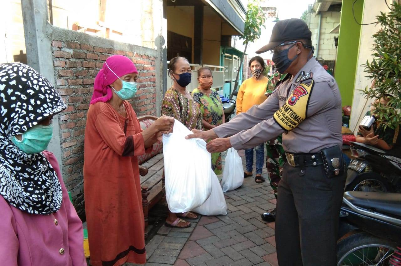 Seputarperak.com- Polsek Kenjeran, Polres Pelabuhan Tanjung Perak membagikan Sembako gratis kepada para perempuan manula warga Jalan Kalilom Lor Indah, Selasa siang, 21 April 2020.