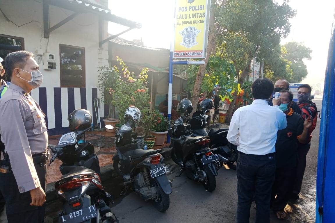 Seputarperak.com- Pengecekan suhu tubuh dan penyemprotan disinfektan dilaksanakan anggota Polsek Asemrowo dan instansi samping yang bertugas di Pospam Operasi Ketupat Semeru di Jalan Dupak Rukun, Senin, 27 April 2020.
