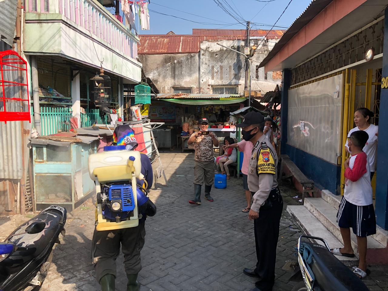 Seputarperak.com- Penyemprotan disinfektan dilakukan Aiptu Made Suarthana, Babinkamtibmas Bongkaran, Polsek Pabean Cantikan, Polres Pelabuhan Tanjung Perak bersama Satpol PP dan LPMK di pemukiman Jalan Kalianyar Kulon dan Jalan Pengampon, Sabtu pagi, 2 Mei 2020.