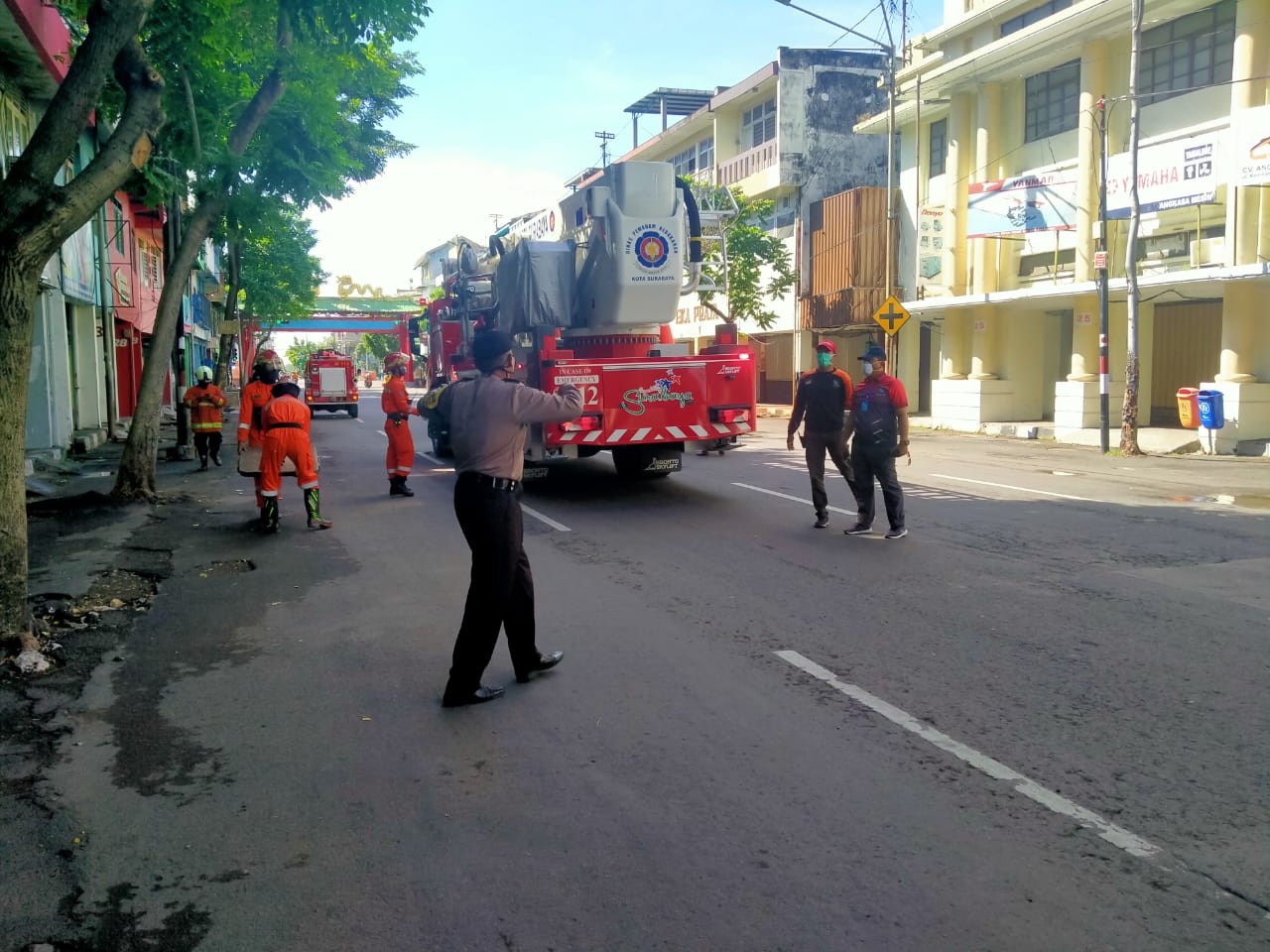 Seputarperak.com- Penyemprotan disinfektan dilakukan petugas pemadam kebakaran (Damkar) di sepanjang Jalan Kembang Jepun, Minggu pagi, 10 Mei 2020.