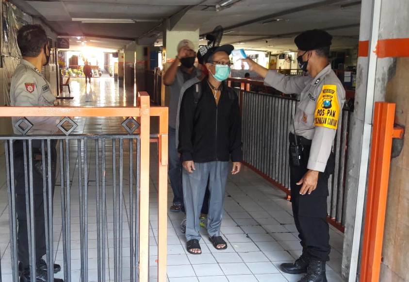 Seputarperak.com- Pemeriksan suhu badan dilakukan personil Pospam Polsek Pabean Cantikan, Polres Pelabuhan Tanjung Perak kepada para penumpang kereta api di Jalan Stasiun Kota, Minggu, 10 Mei 2020.