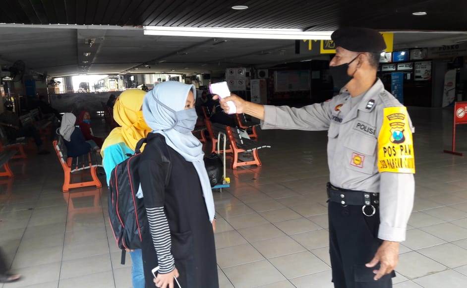 Seputarperak.com- Anggota piket Pospam Operasi Ketupat Semeru dan Check Point Polsek Pabean Cantikan, Polres Pelabuhan Tanjung Perak melakukan pemeriksaan suhu badan penumpang kereta api di Stasiun Surabaya Kota, Minggu pagi, 24 Mei 2020.