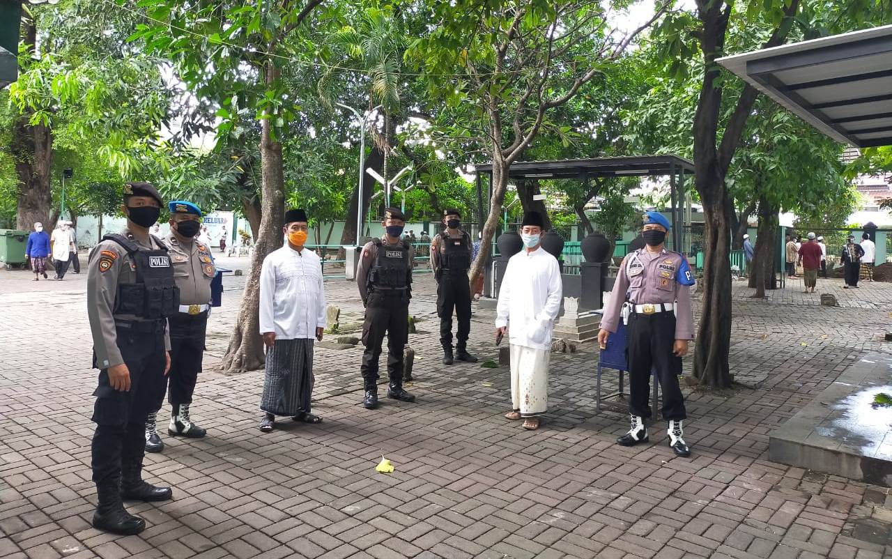 Seputarperak.com- Anggota Satsabhara Polres Pelabuhan Tanjung Perak melakukan pengamanan kegiatan pemakanan H.M Azmi Nawawi, ketua takmir Masjid Agung Sunan Ampel, Selasa siang, 26 Mei 2020.