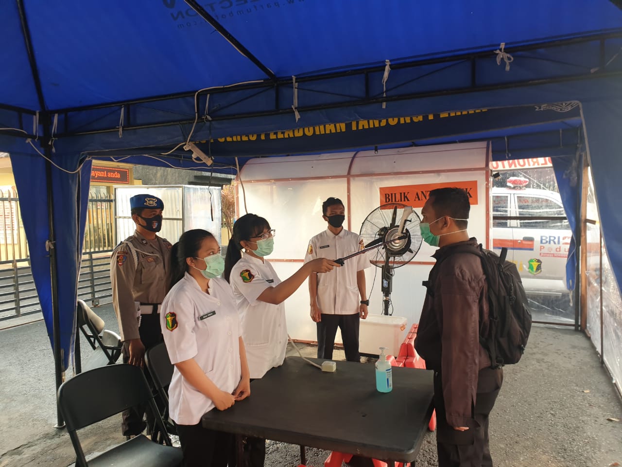Seputarperak.com- Pengecekan suhu badan dilakukan Urkes Polres Pelabuhan Tanjung Perak, kepada para personil, ASN, PHL dan tamu yang akan masuk ke lingkungan Mako, Rabu pagi, 27 Mei 2020.
