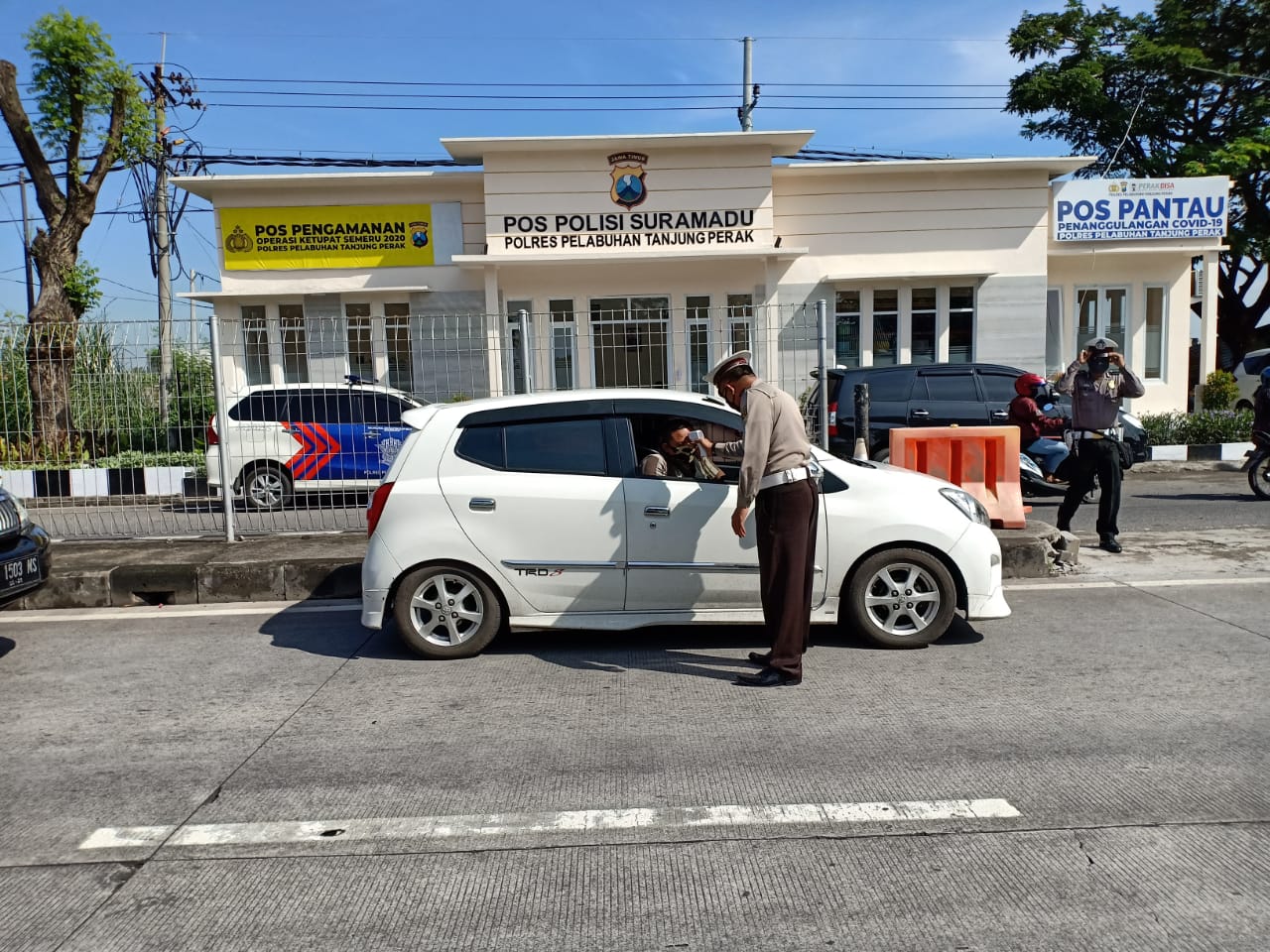 Seputarperak.com- Penyekatan kendaraan dilakukan anggota piket Pospam Operasi Ketupat Semeru dan Check Poin Suramadu, Polres Pelabuhan Tanjung Perak, Jumat pagi, 29 Mei 2020.