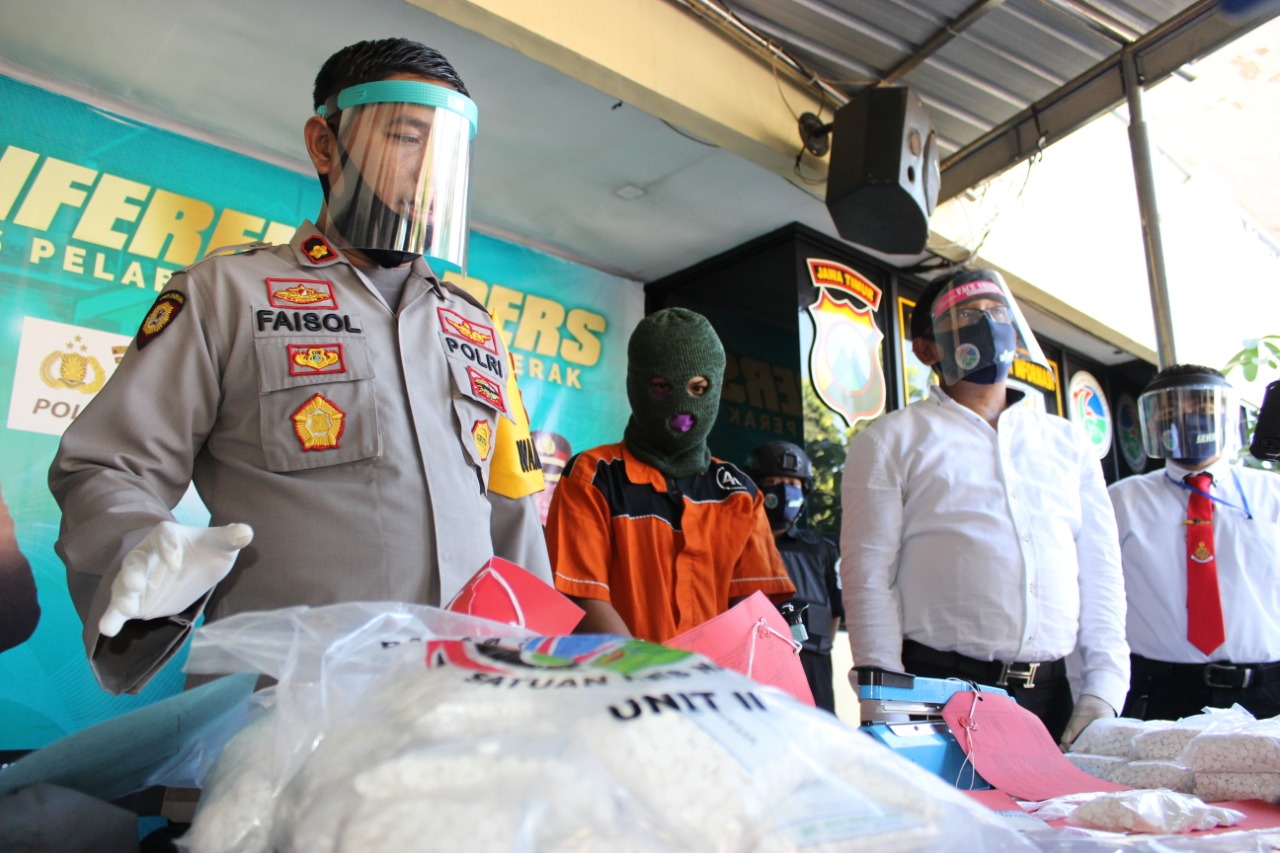 Dalam konferensi pers yang dipimpin Wakapolres Kompol Ahmad Faisol Amir, S.I.K, M.Si yang didampingi Kasat Reskoba AKP M Yasin, 3 pelaku tersebut dihadirkan bersama barang bukti, Senin siang, 8 Juni 2020.