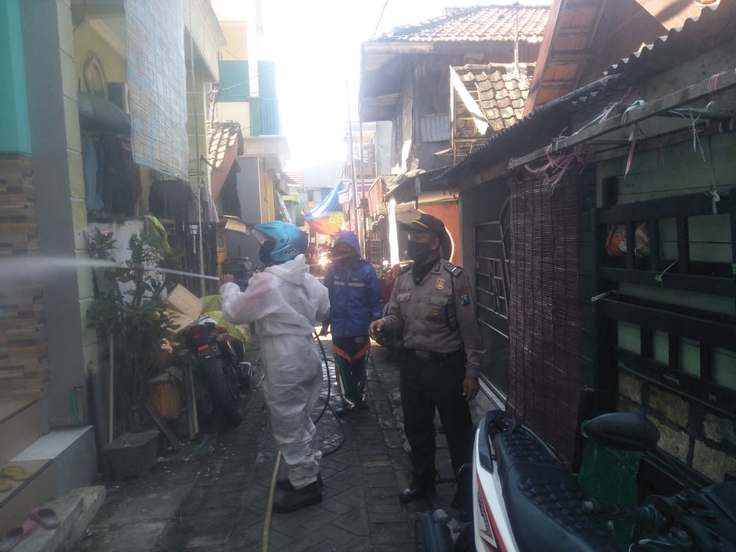 Seputarperak.com- Penyemprotan disinfektan dilakukan petugas pemadam kebakaran (Damkar) Pemkot Surabaya di Kampung Rukun Nelayan RW 8, Kelurahan Morokrembangan, Kecamatan Krembangan, Kamis siang, 18 Juni 2020.