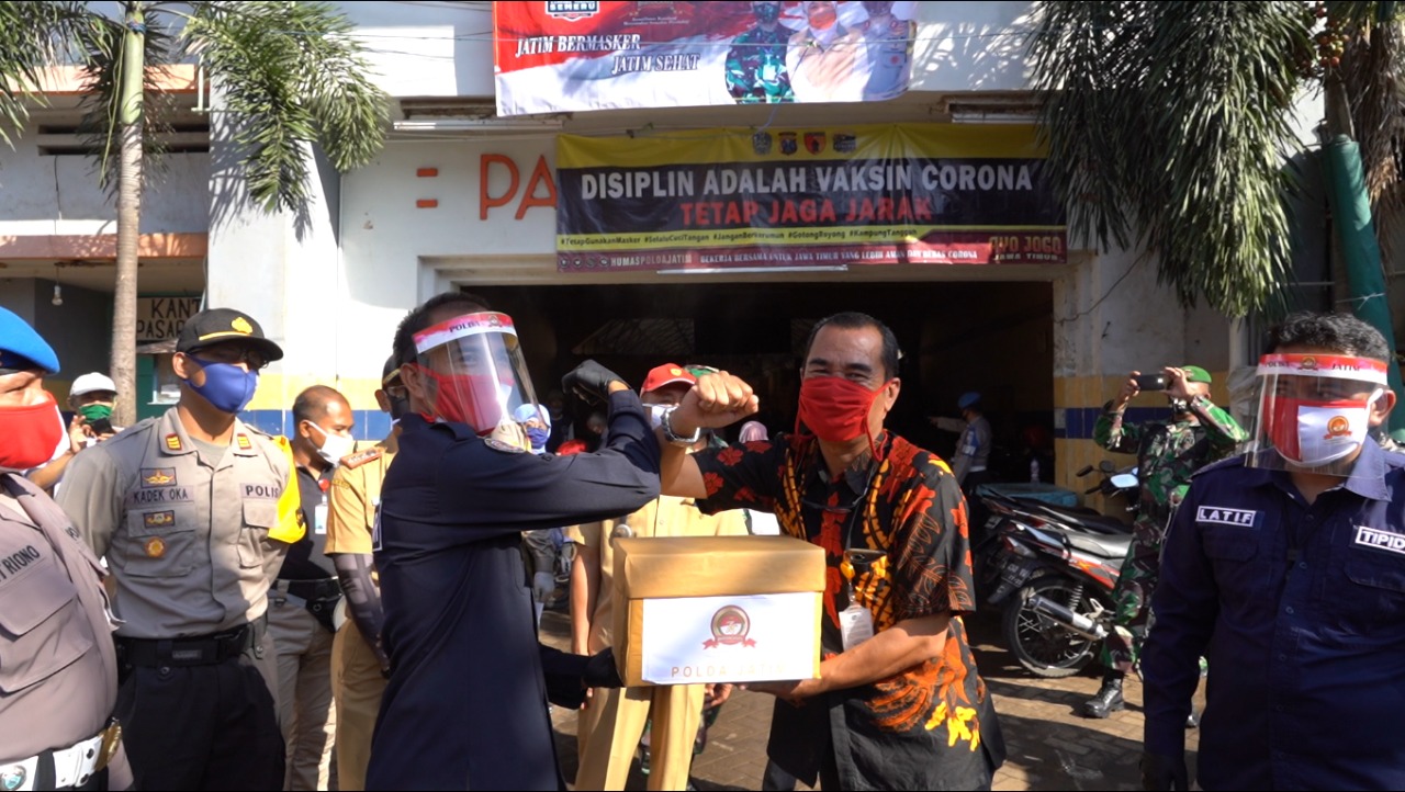 Seputarperak.com- Dalam rangka memperingati Hari Bhayangkara Ke 74, Polda Jatim menggelar bakti sosial memberikan masker dan hand sanitizer kepada pengunjung dan pedagang di Pasar Bawang, Kecamatan Pabean Cantikan, Senin, 22 Juni 2020.