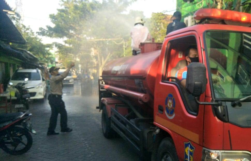 Seputarperak.com- Penyemprotan disinfektan dilakukan petugas PMK di sepanjang Jalan Alun-Alun Bangunsari Selatan, Kelurahan Dupak, Selasa sore, 23 Juni 2020.