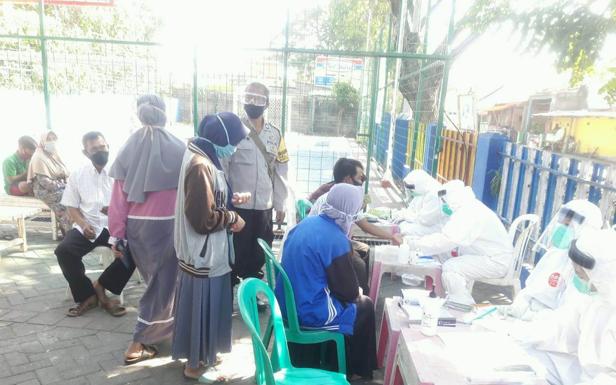 Seputarperak.com- Pengamanan kegiatan rapid tes dilakukan Aiptu Choifin, Babinkamtibmas Kenjeran, Polsek Kenjeran, Polres Pelabuhan Tanjung Perak di RW 02 Kejawan Lor, Kelurahan Kenjeran, Selasa siang, 30 Juni 2020.