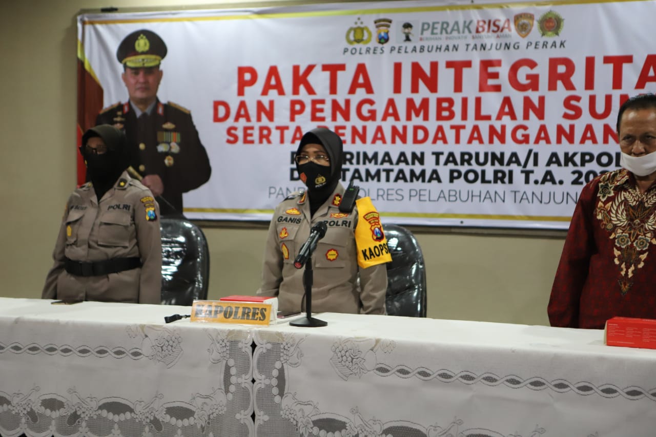 Seputarperak.com- Polres Pelabuhan Tanjung Perak menggelar pembacaan pakta integritas dan pengambilan sumpah serta penandatanganan MoU penerimaan Taruna Akpol dan Tamtama tahun anggaran 2020 di ruang Aula Rupatama Sanika Satyawada, Kamis siang, 2 Juli 2020.