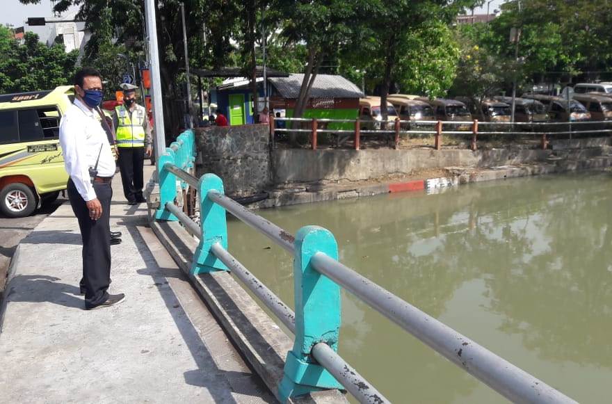 Seputarperak.com- Pemantauan debit air dilakukan personil Polsek Pabean Cantikan, Polres Pelabuhan Tanjung Perak di Sungai Kalimas, Senin siang, 6 Juli 2020.