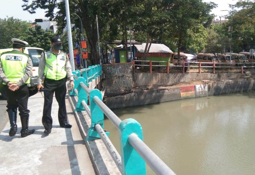 Seputarperak.com- Personil Polsek Pabean Cantikan, Polres Pelabuhan Tanjung Perak melakukan pengecekan debit air di Sungai Kalimas, Selasa pagi, 7 Juli 2020.