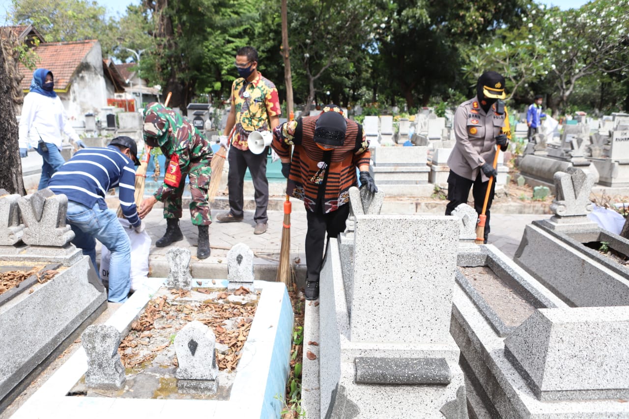 Seputarperak.com- Kapolres Pelabuhan Tanjung Perak, AKBP Ganis Setyaningrum, S.Si, MH mengikuti kegiatan kerja bakti bersama Walikota Surabaya Dr. Ir. Tri Rismaharini, MT di Makam Mbah Ratu, Jalan Sedayu, Kecamatan Krembangan, Sabtu siang, 11 Juli 2020.