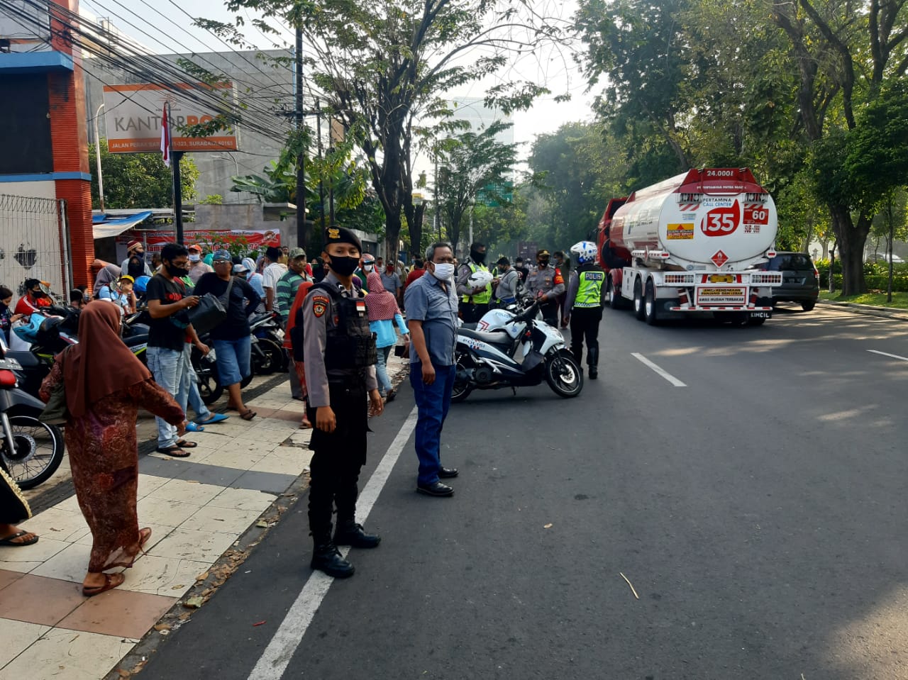 Saat itu sambil melakukan pengamanan, personil Satsabhara dan Satlantas Polres Pelabuhan Tanjung Perak juga menyampaikan himbauan protokol kesehatan pencegahan Covid-19 kepada warga yang mengantri.