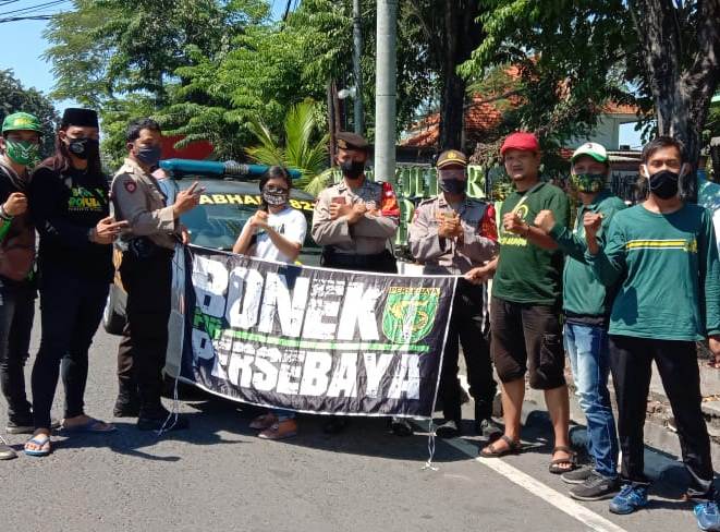 Seputarperak.com- Panit Binmas Polsek Krembangan, Polres Pelabuhan Tanjung Perak, Ipda Dwi Eko Musaghfirin melakukan pendampingan kepada anggota komunitas Bonek yang sedang melaksanakan kegiatan bakti sosial, Minggu pagi, 19 Juli 2020.