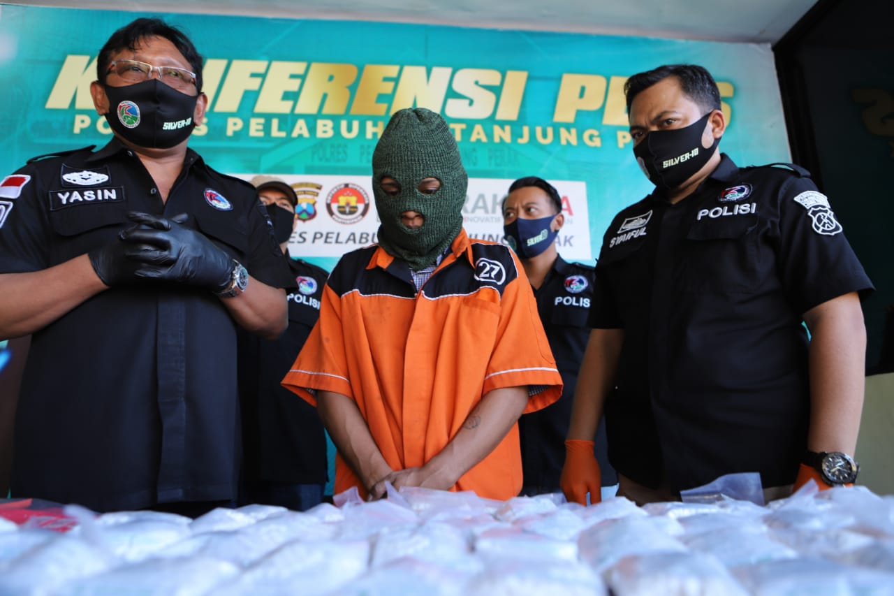Seputarperak.com- Konferensi pers penangkapan pengedar narkoba jenis pil double L digelar Polres Pelabuhan Tanjung Perak, Minggu, 19 Juli 2020.