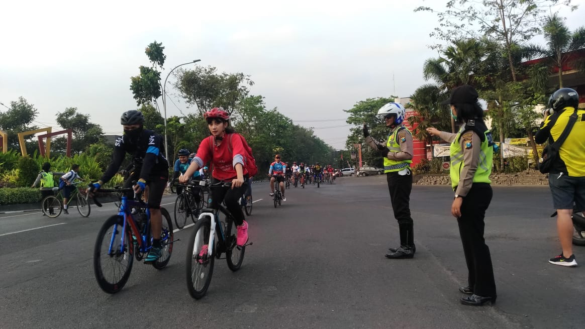 Kendaraan bermotor yang hendak menuju Jalan Jakarta, saat itu terpaksa distop sementara, agar perjalanan peserta funbike tidak terganggu.
