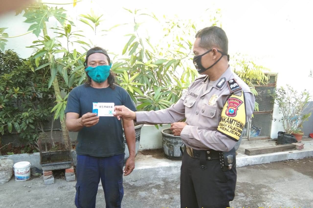 Seputarperak.com- Aiptu Lagiman, Babinkamtibmas Tanah Kali (Takal) Kedinding, Polsek Kenjeran, Polres Pelabuhan Tanjung Perak menyerahkan bantuan obat herbal Lianhua Qingwen kepada Bapak Sugik, warga Kedinding Tengah Jaya, Selasa siang, 28 Juli 2020.